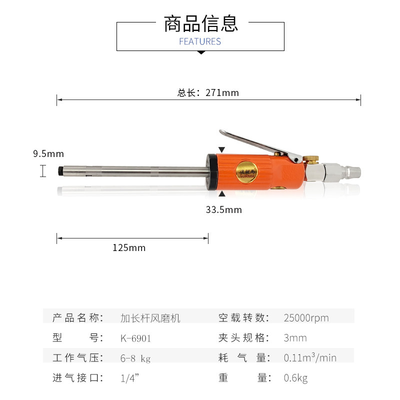 Speed sharp horse pneumatic K-6901 extension rod wind mill gas engraved grinder industrial grade grinder grinding 3mm chuck