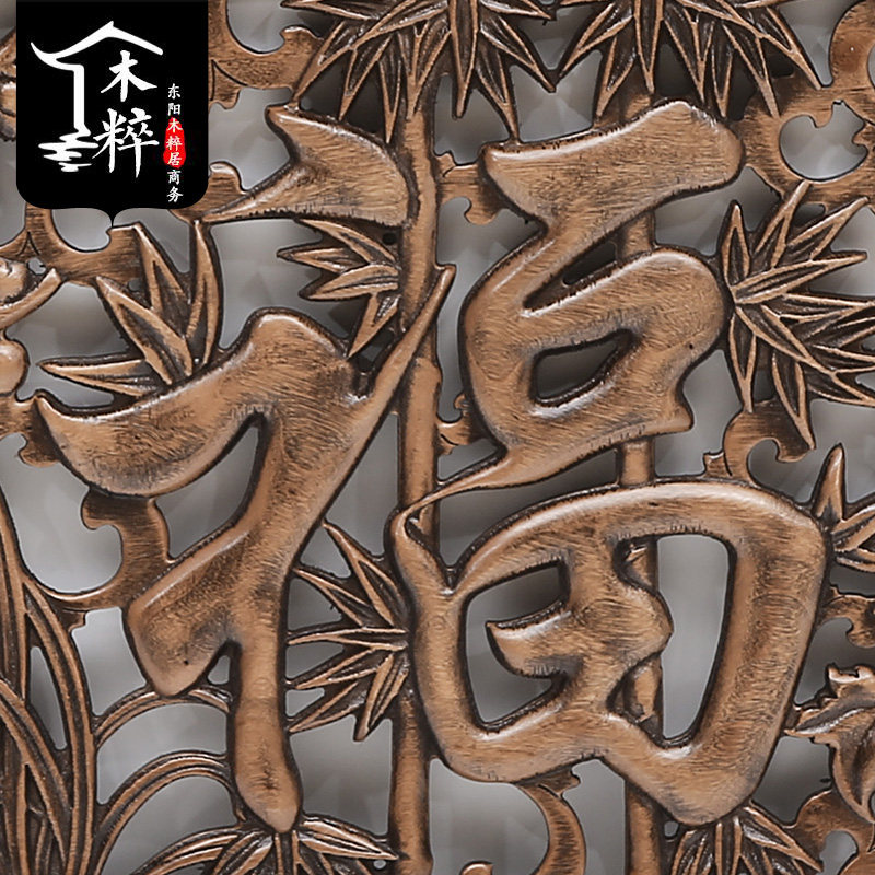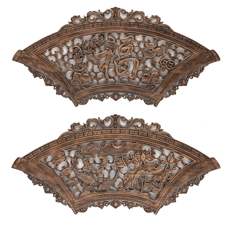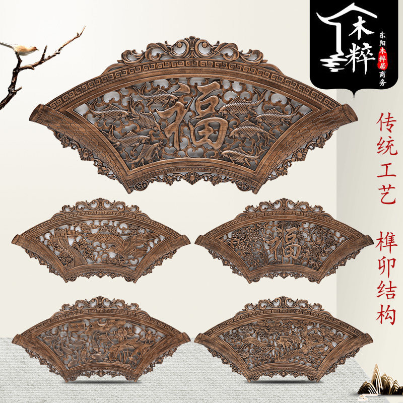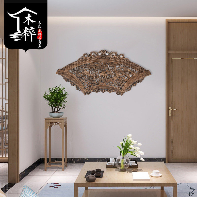 Dongyang wood carving pendant camphor wood log Chinese style solid wood ancient style living room porch fan-shaped wall hanging hollow decorative painting