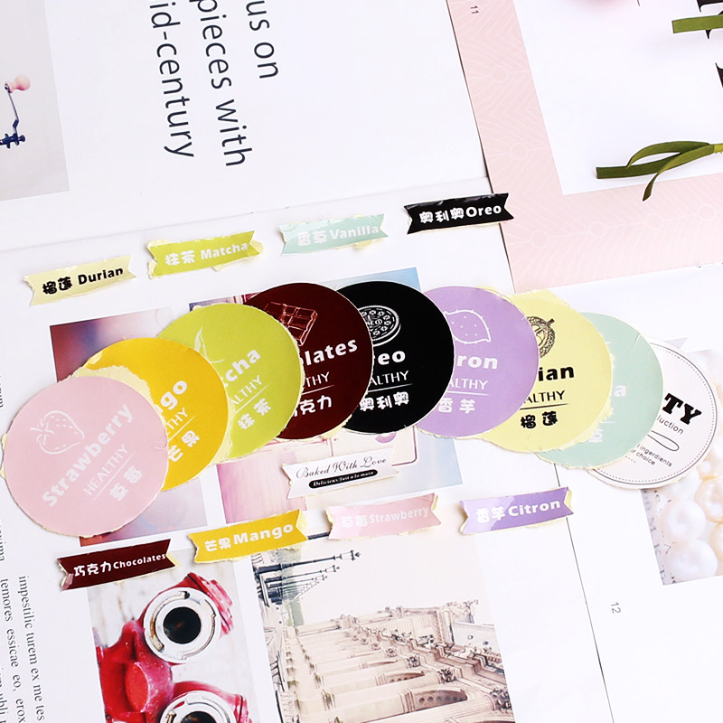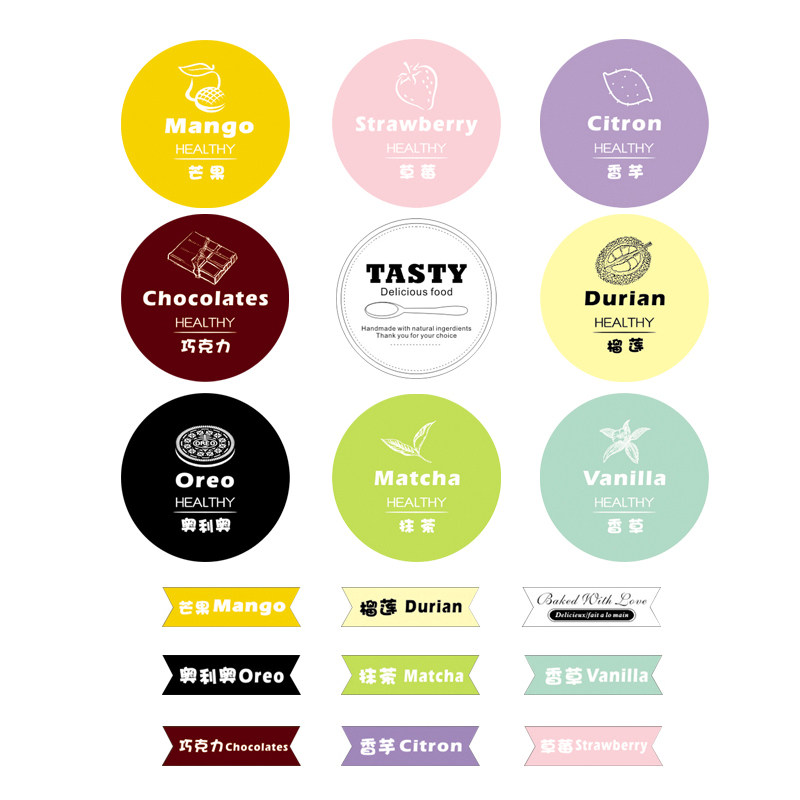 Mango round stickers 100 stickers Strawberry round stickers 100 stickers Vanilla round stickers 100 stickers Durian round stickers 100 stickers Universal round stickers 100 stickers Matcha round stickers 100 stickers