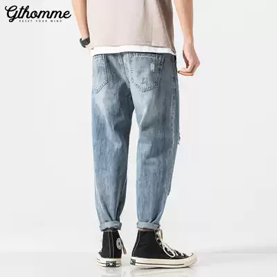 Autumn Tide brand men's hole jeans loose straight Korean version of the trend thin ins ankle-length pants men's light color