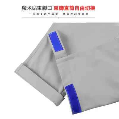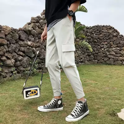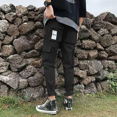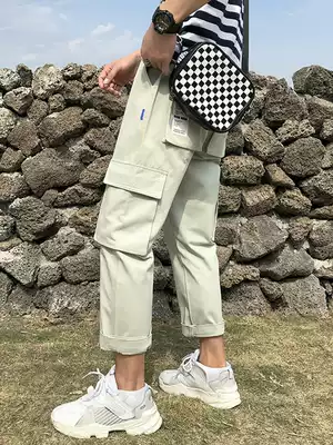 Summer drawstring overalls men's multi-pocket tide brand straight tube loose leg nine-point pants casual pants Korean version of the trend