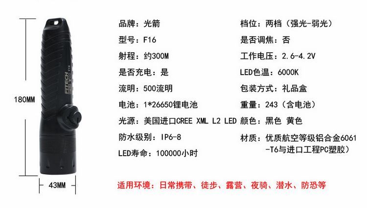 Light Arrow F16 Pro t6 Strong Light Long Range USB Charging Water Flashlight Anti-Lighting Diving Flashlight