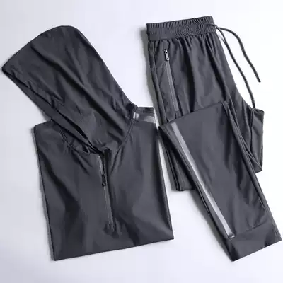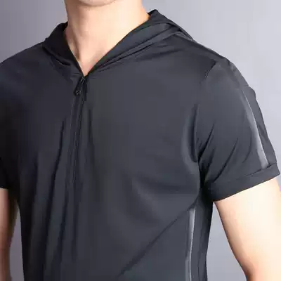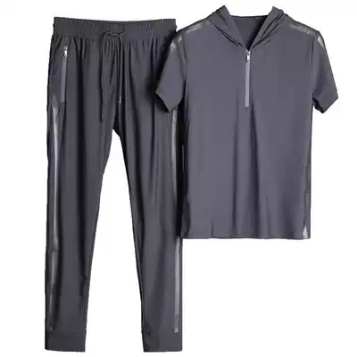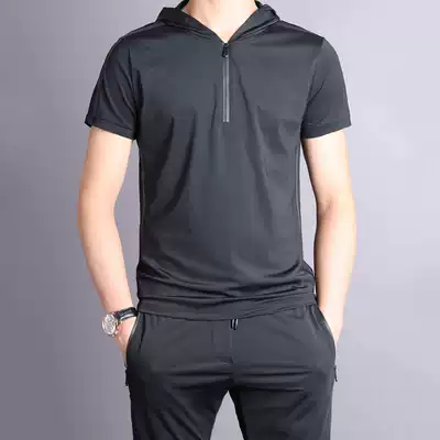 Light luxury brand summer thin silky casual sports suit men's ice silk short-sleeved trousers hooded black two-piece suit