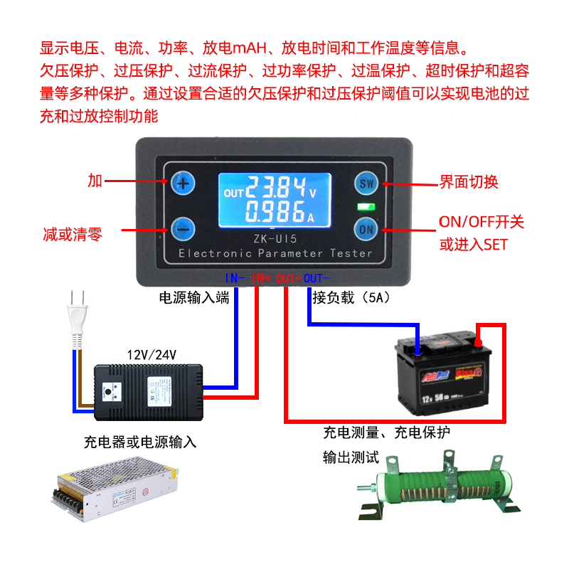 Voltage ammeter Power capacity Time Undervoltage overvoltage protection Multi-function battery charge and discharge control UI5