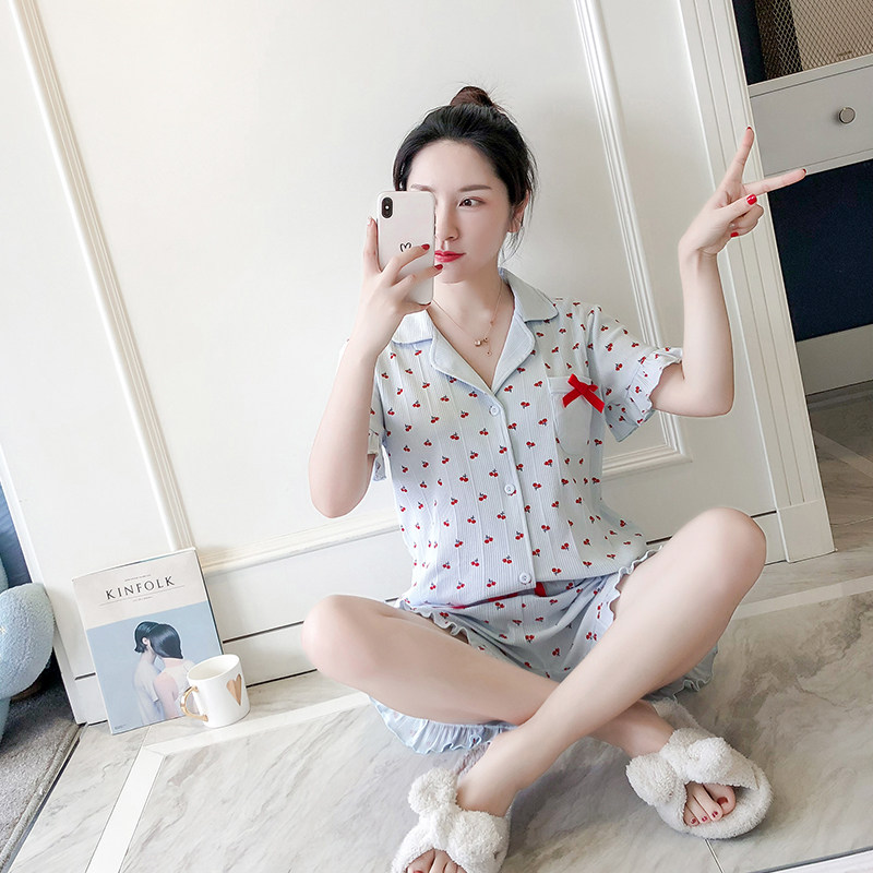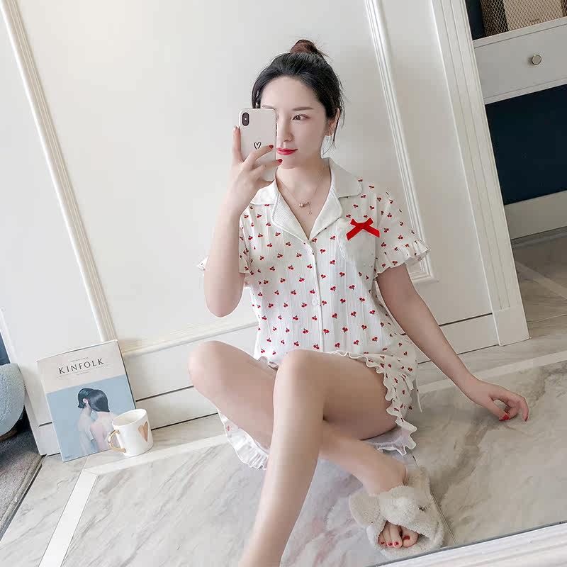 Pure cotton short-sleeved pajamas suit women's summer simple INS wind shirt sweet and cute Korean version Yin Tao girl home service