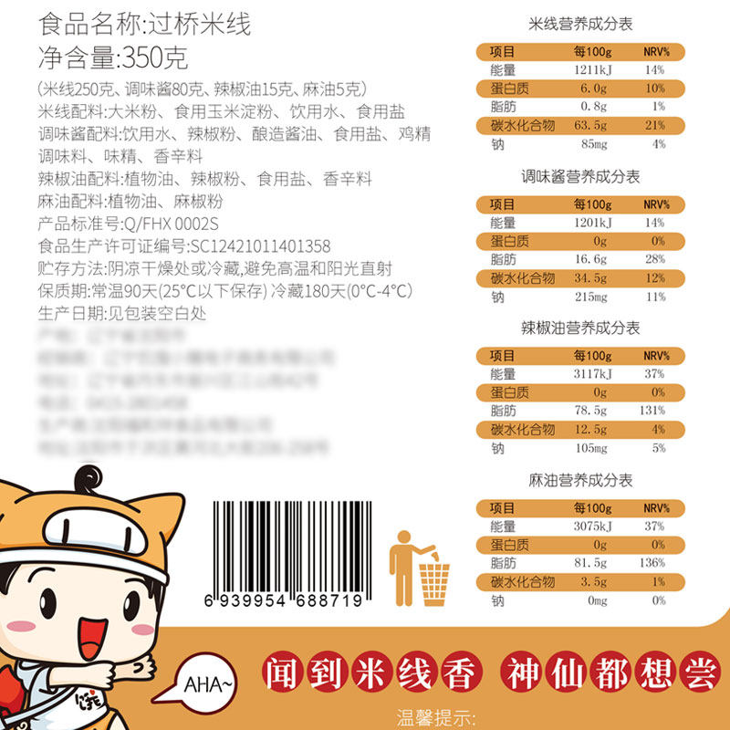 Rice Noodle Ingredients (Rice Powder Edible Corn Starch Drinking Water Edible Salt) Seasoned Sauce Ingredients (Drinking Water Chili Powder Brewing Soy Sauce Edible Salt Chicken Fine Seasonings MSG Spice Spice Spice) chili oil (vegetable oil