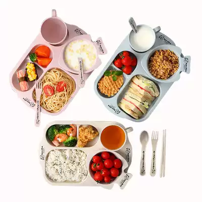 Baby portable tableware set Wheat straw children's bowl Cute cartoon grid plate anti-fall children's eating bowl