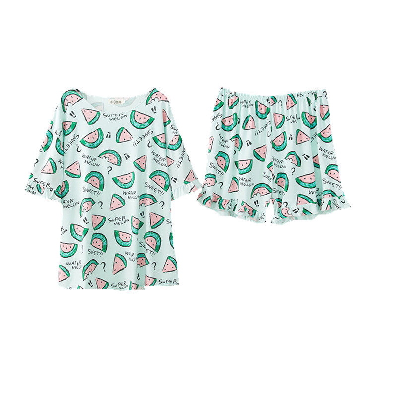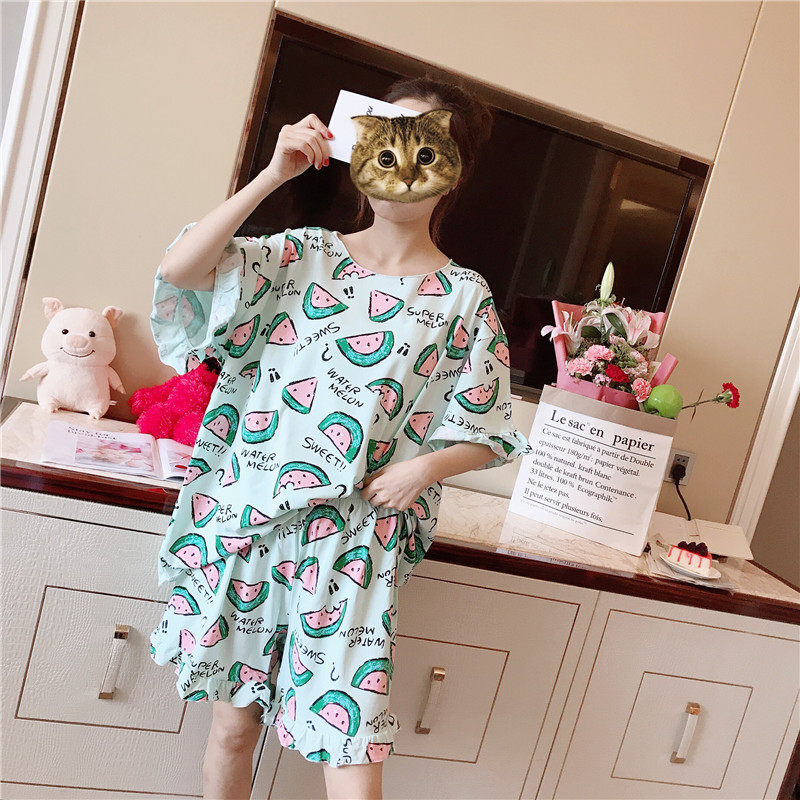 Summer short-sleeved pajamas women's thin cotton watermelon printed home service loose large size fat sister 200 catties suit