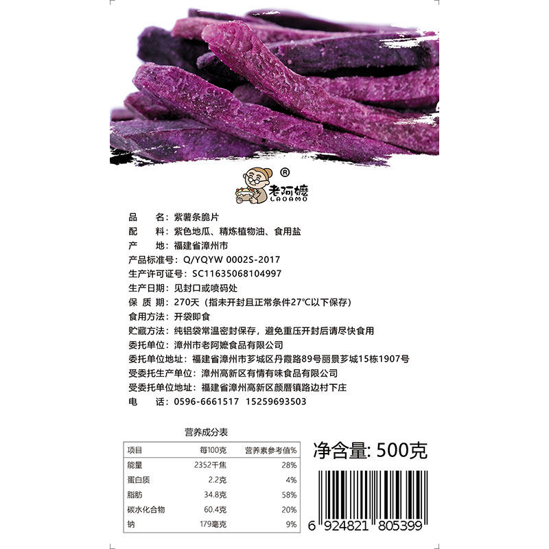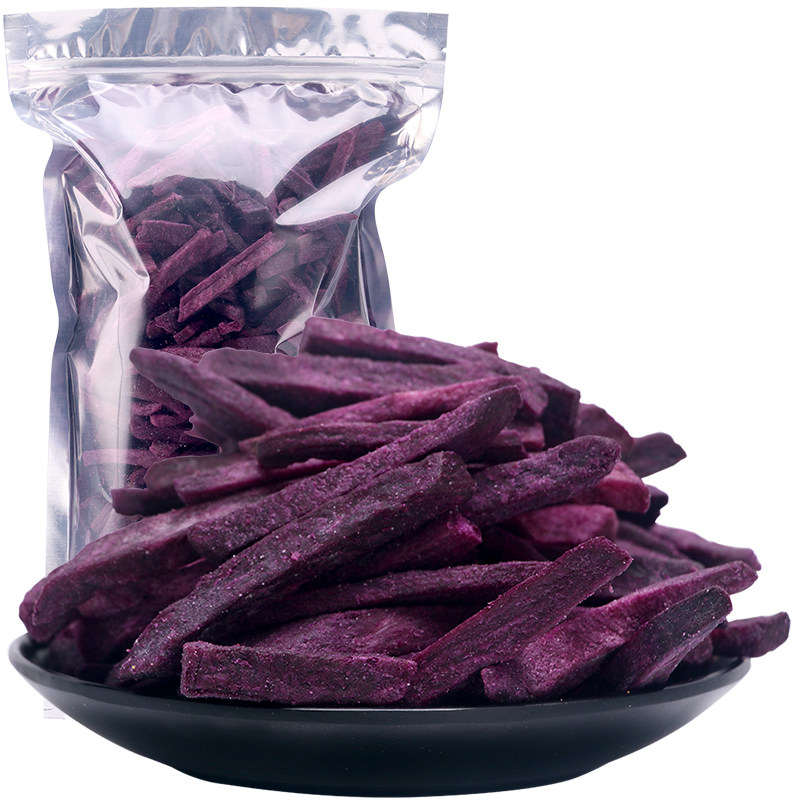 The purple fries are packed with a large package.