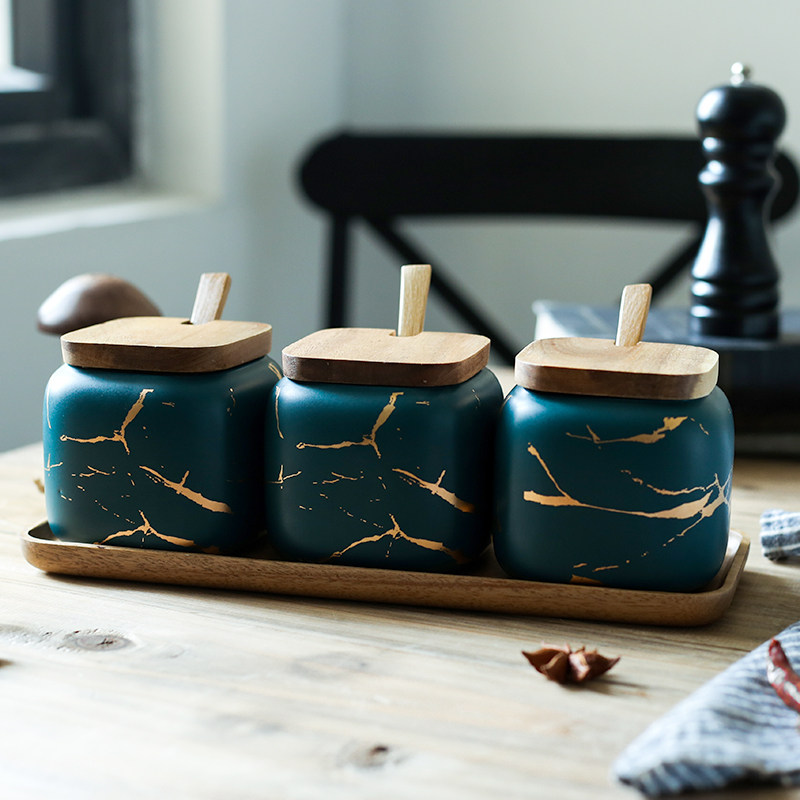 White gold seasoning jar + spoon + wooden lid Black grained gold seasoning jar + spoon + wooden lid Dark green grain gold seasoning jar + spoon + wooden lid Matching wooden pallet White "Grained gold seasoning can set" Black "Grained gold seasoning can set" Dark green "Grained gold seasoning can set"