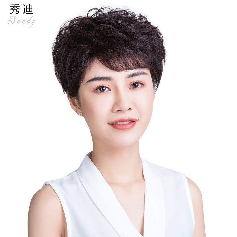 Wig women's short hair full head cover type middle-aged natural real hair Short curly hair mom fashion real hair wig set