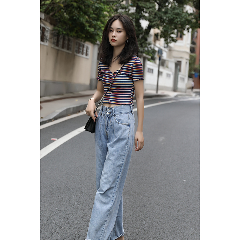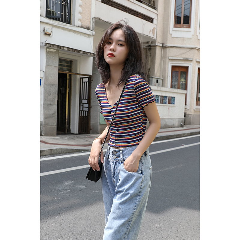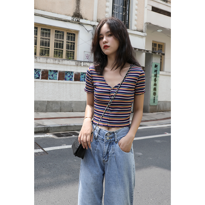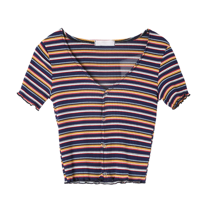 Slim fit stretch color stripe short knitted short sleeve cardigan jacket V-neck Hong Kong style retro top Contrast T-shirt versatile