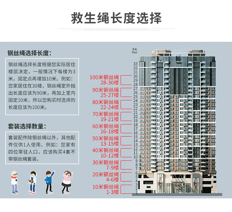 Suit 20 meters (suitable for up to 7 layers) Suit 30 meters (suitable for up to 11 layers) Single safety rope (20 meters) Single safety rope (30 meters)