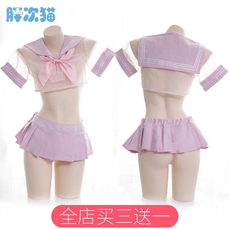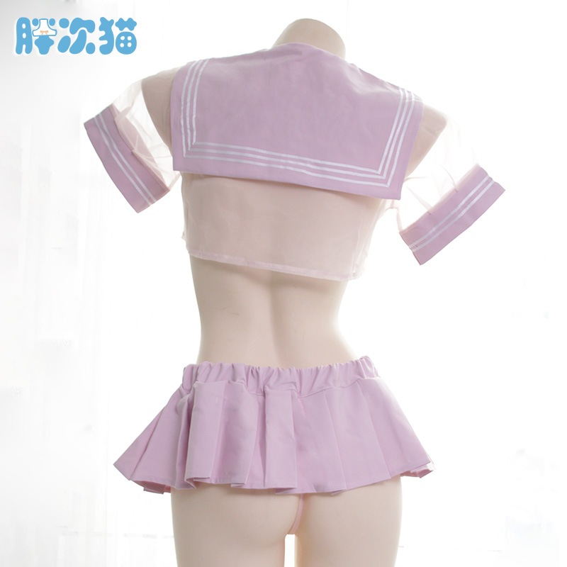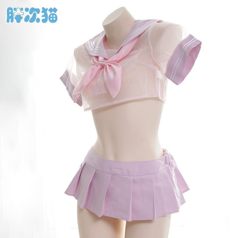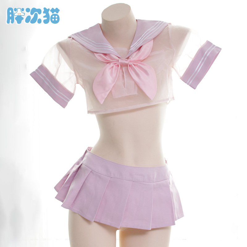 Girl heart burst~Pink transparent mesh sailor suit pajamas set Uniform night dress Student sexy pajamas