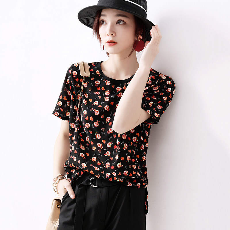 Day Series Women's Clothing Summer New Comfort Breathable Emulated Silk Popper Collision Color Piglet Printed Short Sleeve TEET Shirt