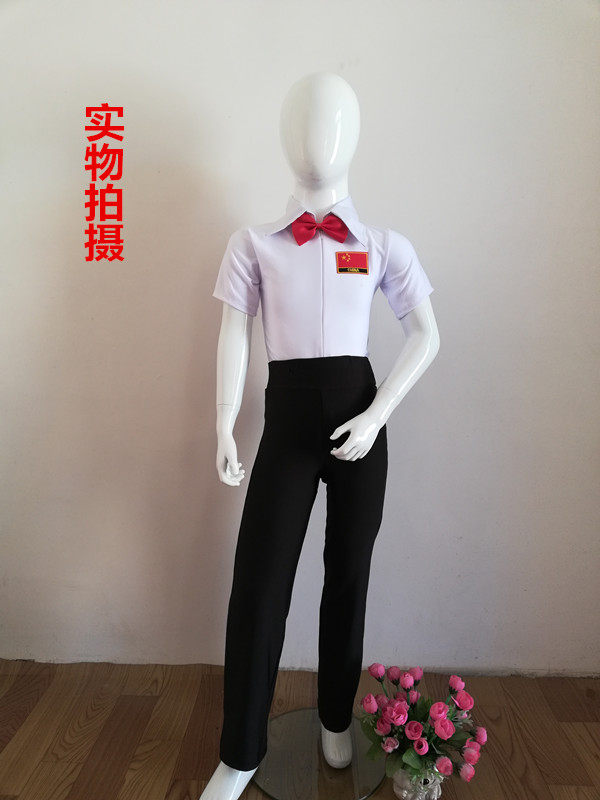White blouse short sleeves pants black collar knot white blouse pants black collar knots with baby bag white blouse pants short sleeves pants tie white blouse pants short sleeves pants tie cuddling bag white