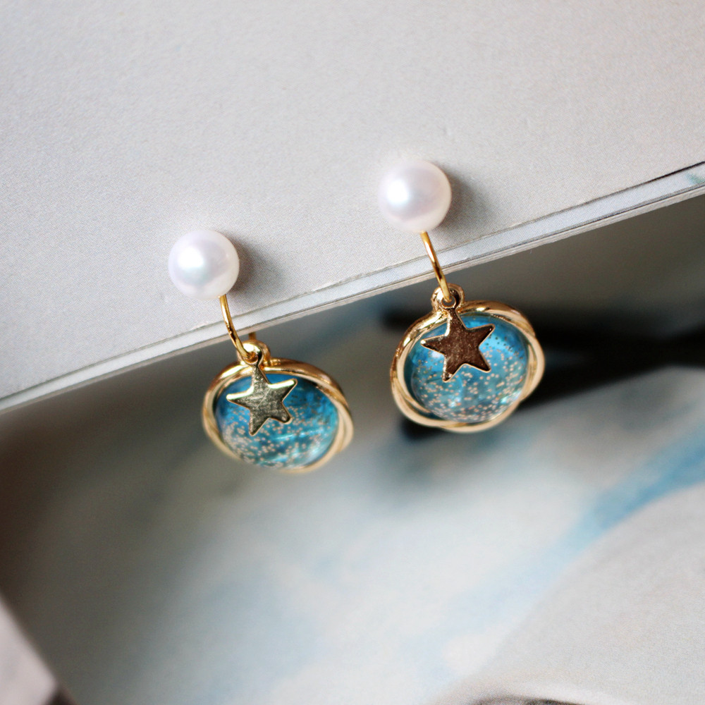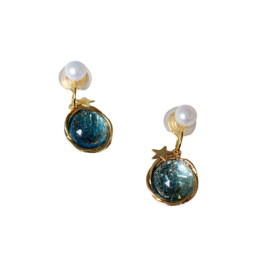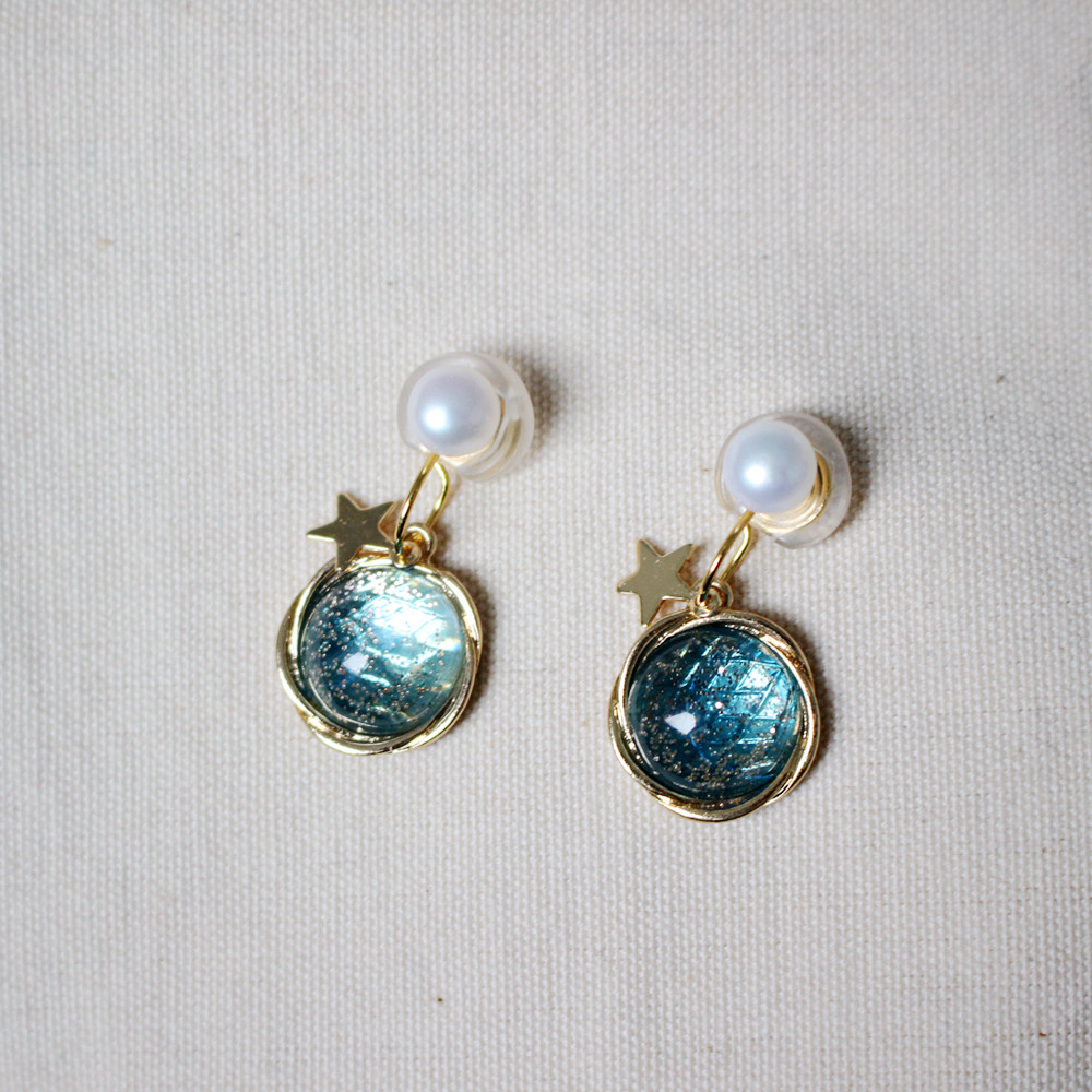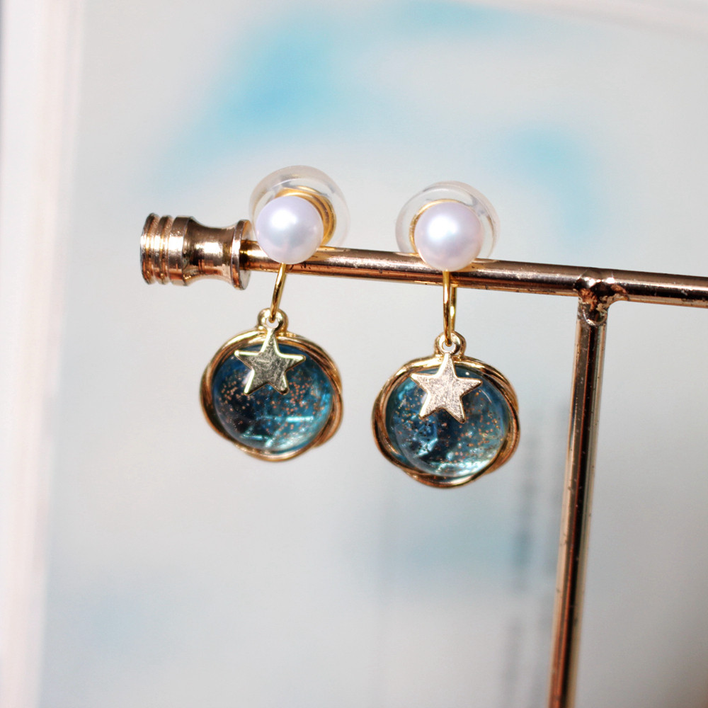 Handmade original custom no ear holes painless mosquito coil plate Natural pearl blue planet star ear clip ear ornaments earrings