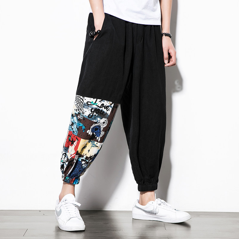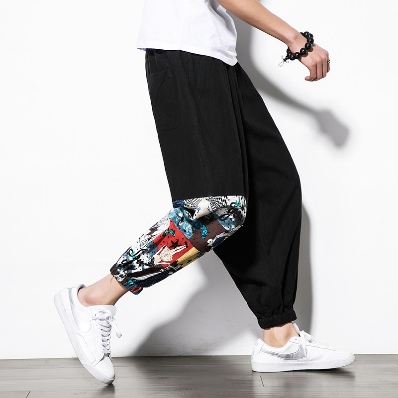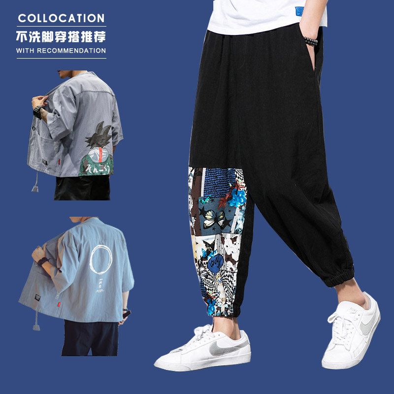Fat Japanese stitching flower cropped pants men's fattening plus size Harlan pants loose breathable Chinese style pants trend
