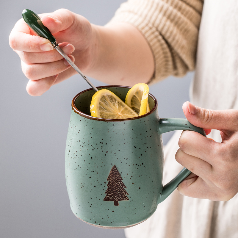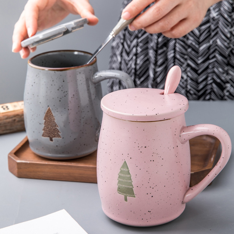 Pine tree hand-painted cup-dark green with lid spoon pine hand-painted cup-rice White with lid with spoon pine hand-painted cup with lid with spoon-pink with lid and spoon pine hand-painted cup with lid with spoon