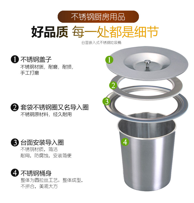 304 stainless steel kitchen countertop trash can embedded whole cabinet Household desktop sink brushed hidden cleaning bucket