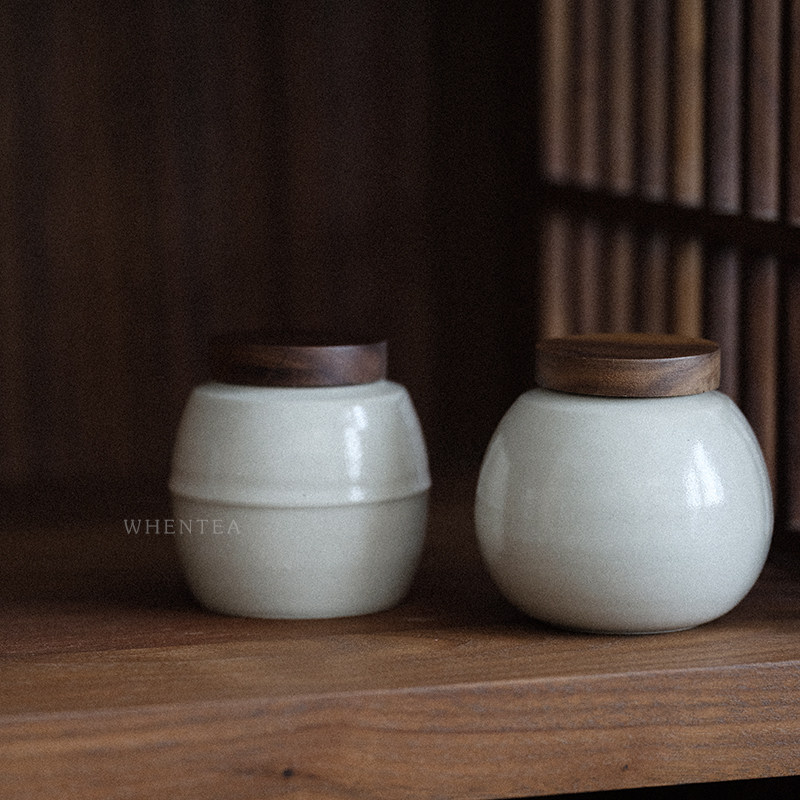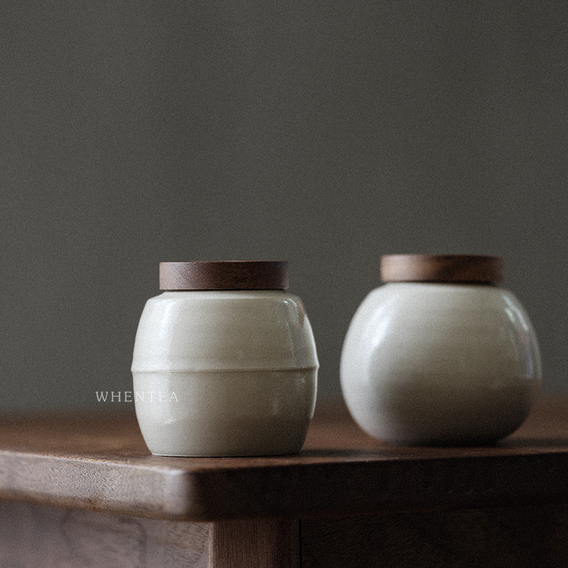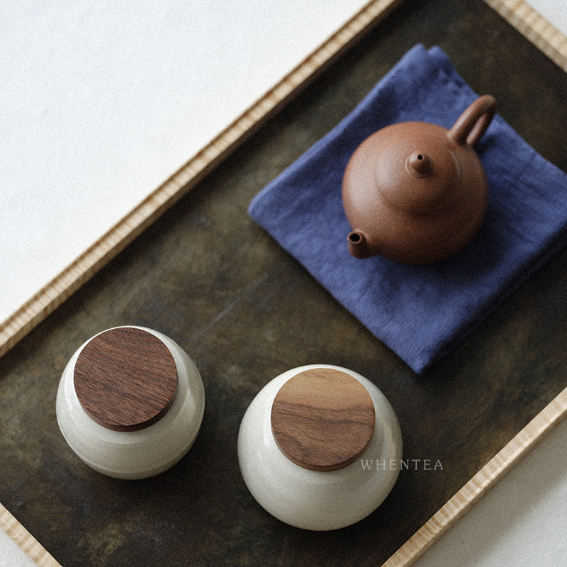 Heard) Day-style wood cotton white tea leaf jar Jingdezhen City made of walnuts wood lid sealed with portable small number of tea cabin