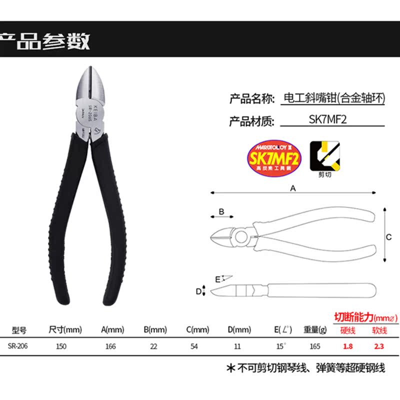 Japan horse brand KEIBA alloy collar oblique mouth pliers with bearing shaft oblique mouth shear pliers SR-206 electrical oblique mouth pliers