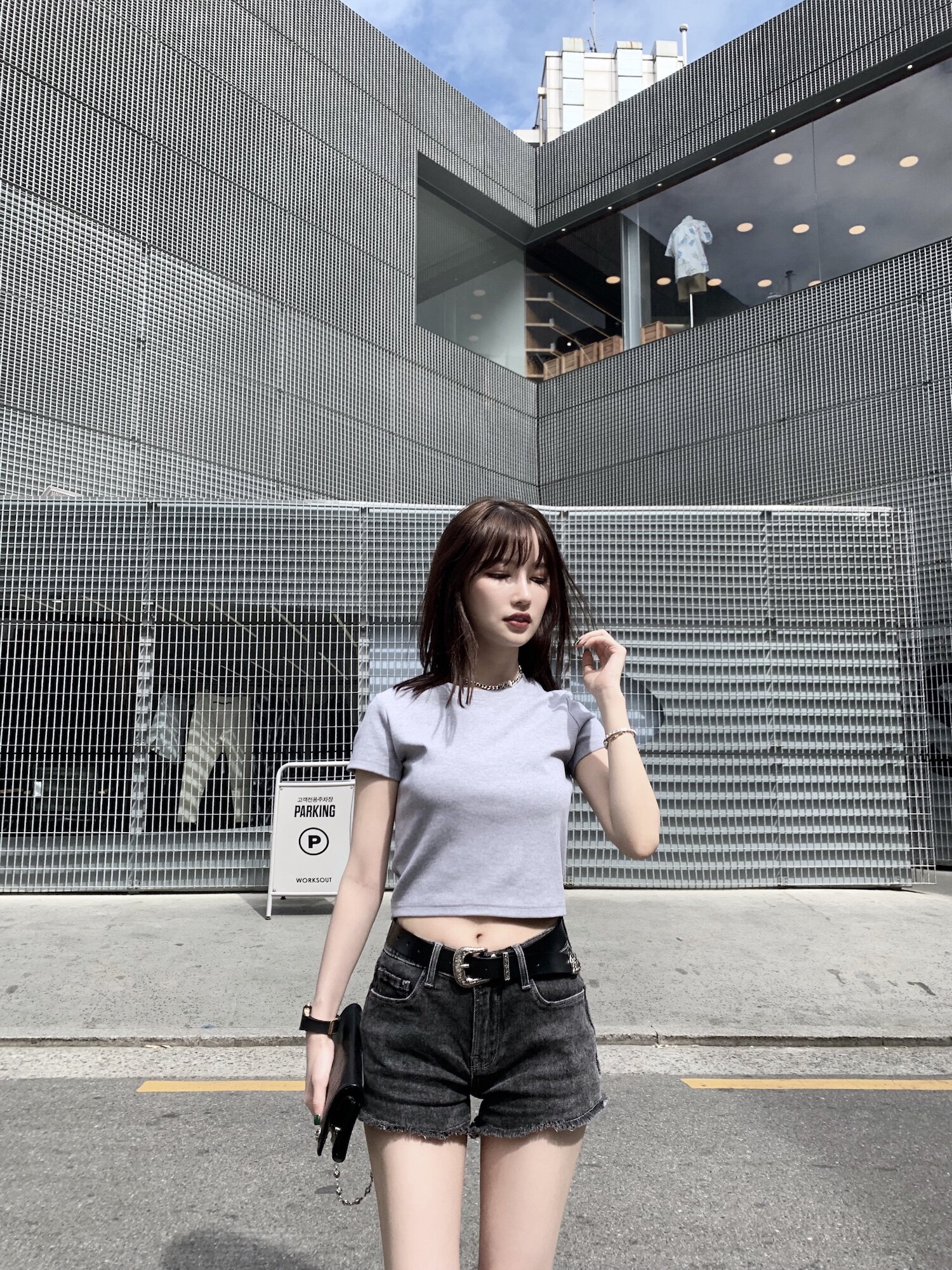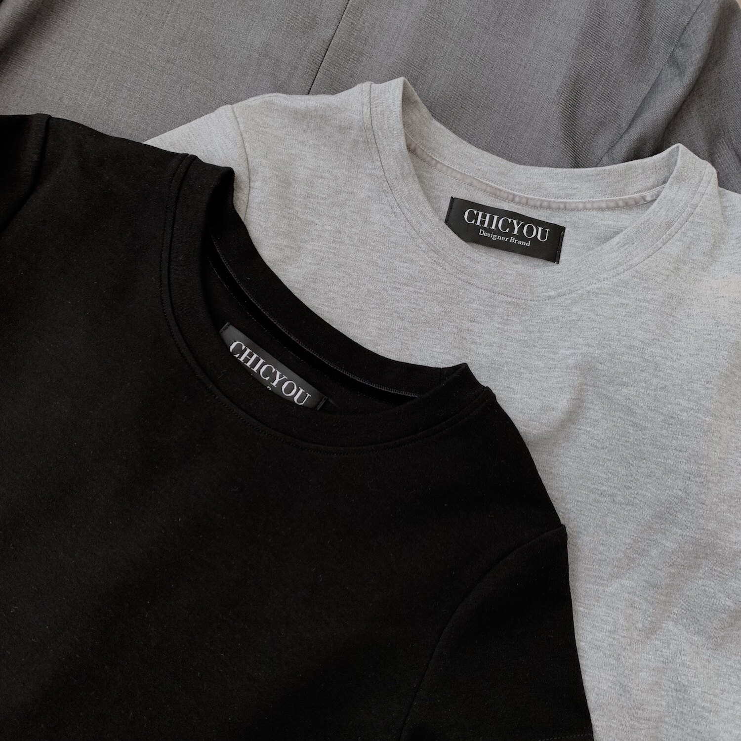 CHICYOU bi entry recommended black and white grey color trims with slim rounded collar short 100 lap T-shirt short sleeve tee