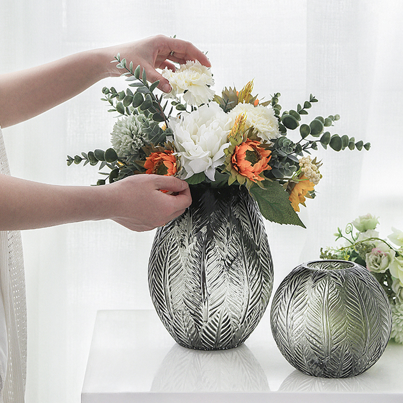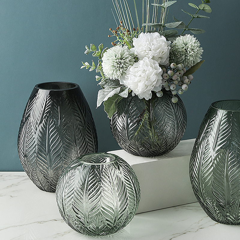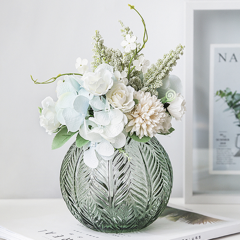 Leaf vein vase Gray large leaf vein vase Gray small leaf vein vase Green Large leaf vein vase Green Small leaf vein green Small white peony bouquet Leaf vein Gray Small white peony bouquet