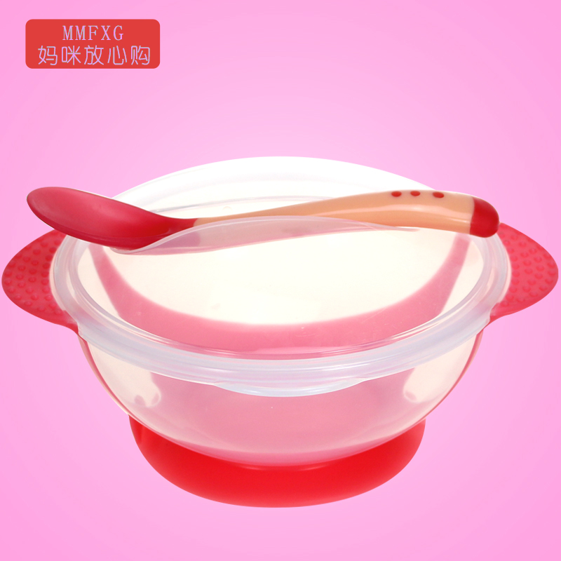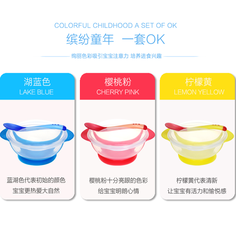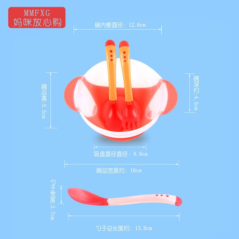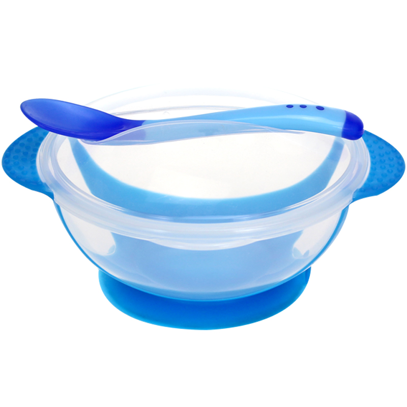 Blue suction cup with lid, thermo-sensing spoon, sponge brush, red suction cup with lid, bowl warming spoon, sponge brush, yellow suction cup, bowl with lid, warming spoon, sponge brush, blue suction cup with lid, thermo-sensing spoon, thermo-sensing fork