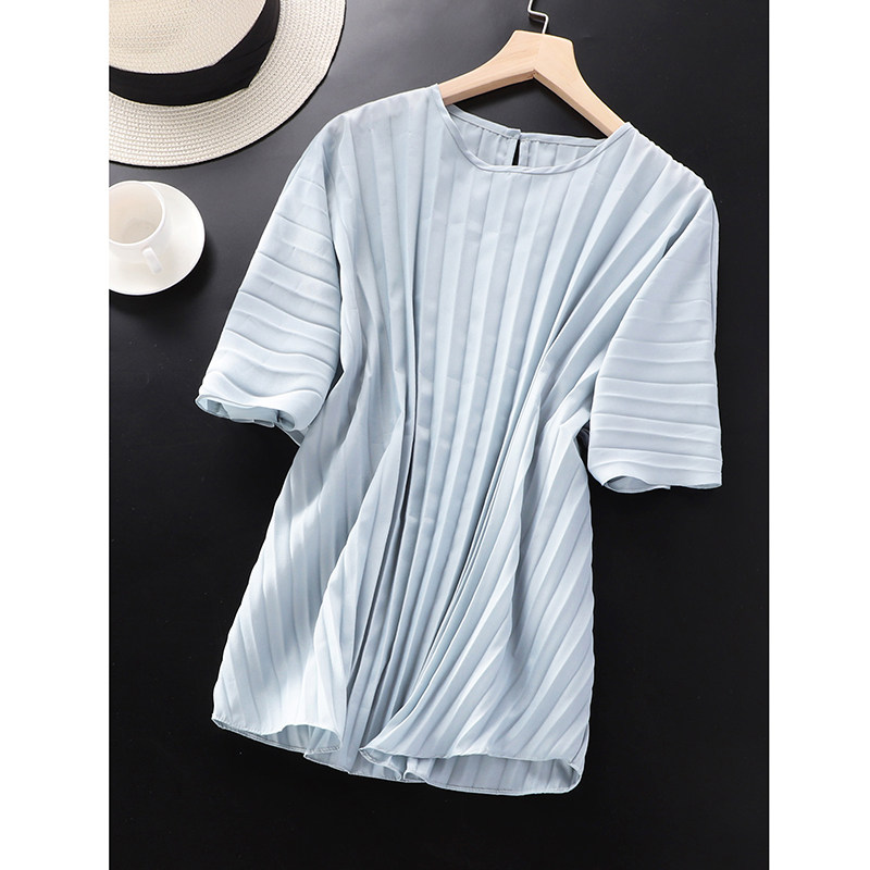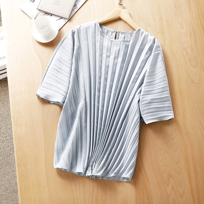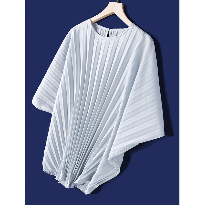Small Crowddesign 100 Pleats Bat Cuff Dyeing Haze Blue Loose Woman Round Collar Short Sleeve Blouse Blouse 67562