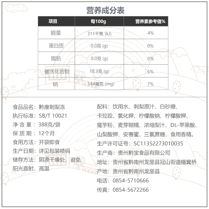 Drinking water Prickly pear juice White sugar Carrageenan Potassium chloride Sodium citrate Potassium citrate Konjac powder Maltodextrin concentrated pear juice DL-Malic acid Potassium sorbate Acesulfame Sucralose Food flavor