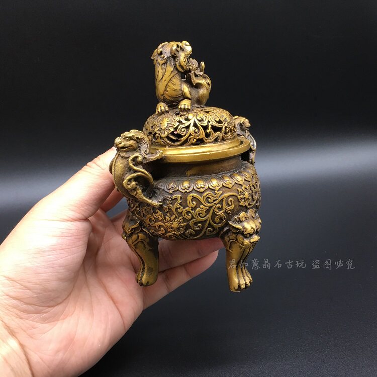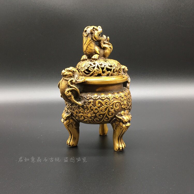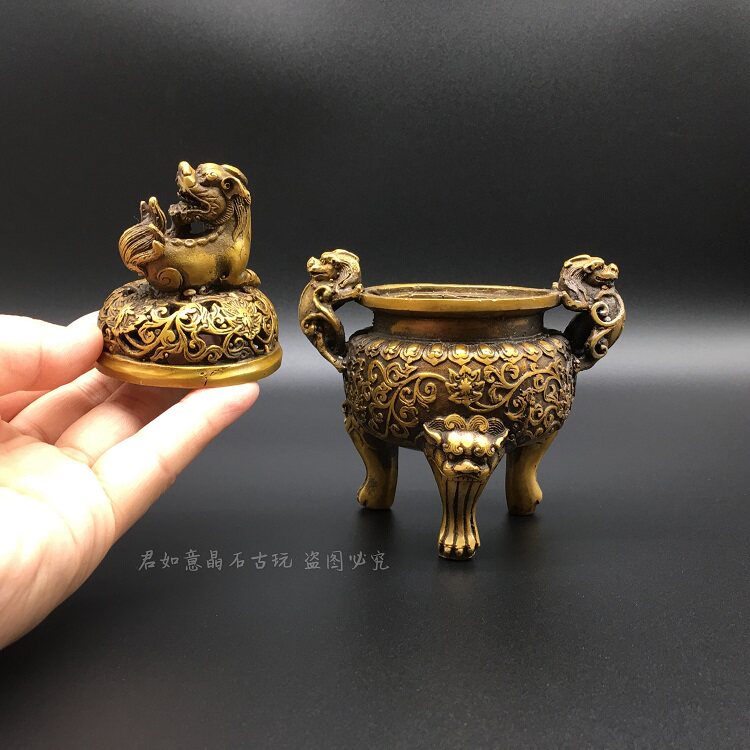 Pure copper Pixiu incense burner copper three-legged double-eared round small incense burner Fragrance burner with lid Pixiu carved three-legged tripod