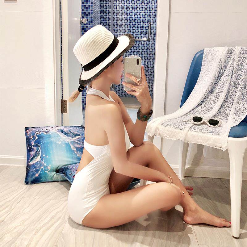 Korean Version Hung Neck Lace Conservative Swimsuit White with Shoulder Swimsuit Woman sense Deep V spa with a bikini