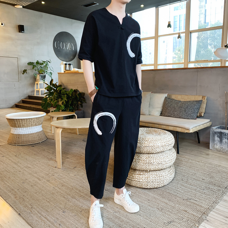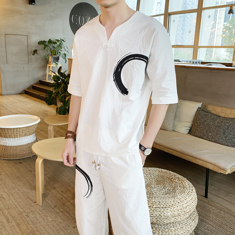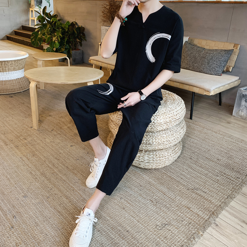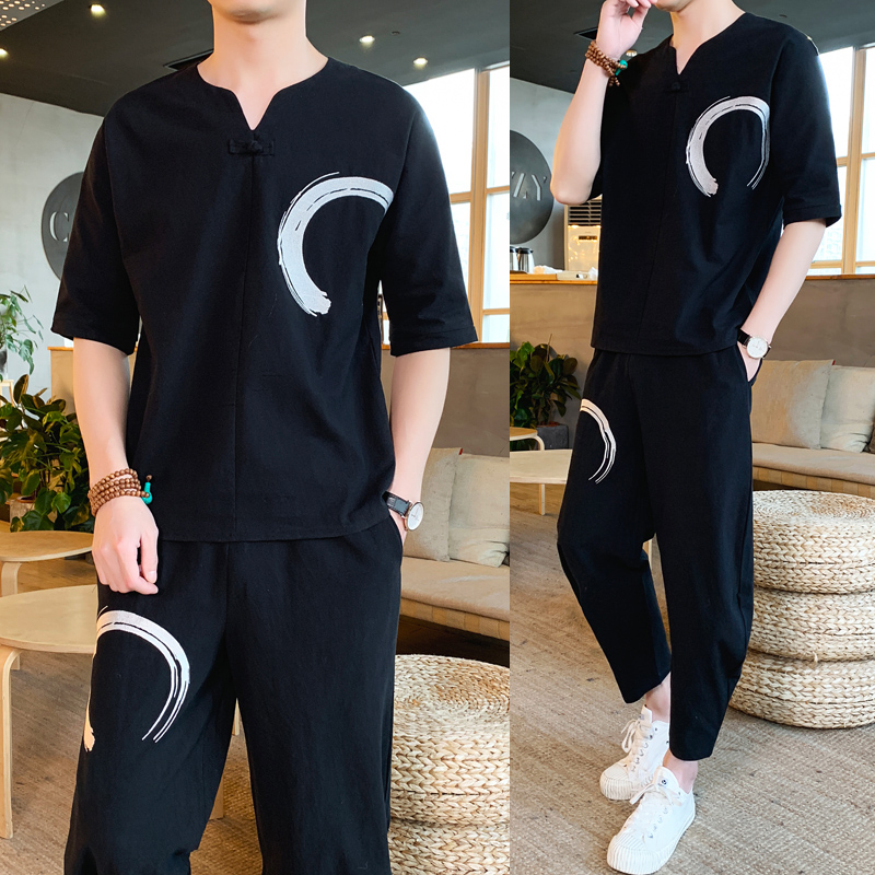 Linen Short Sleeve Men T-Shirt Summer China Wind Loose Two Sets Cotton Linen Casual Hanfu Gats Plus Size Suit