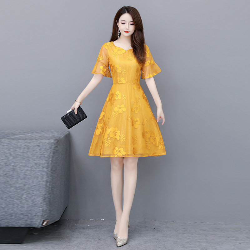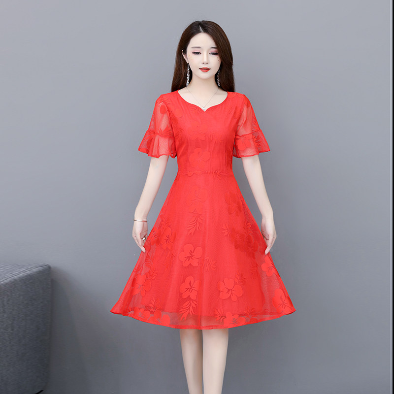 2022 Summer new women's dress Big size Belly Button Slim Lace Dress Fat Mm Medium Long Version Short Sleeve Cashew Dress