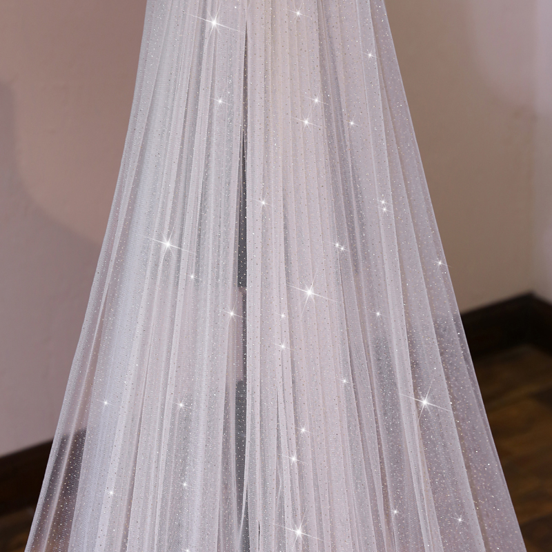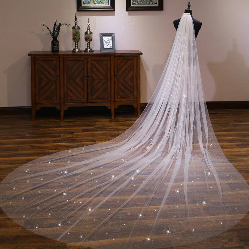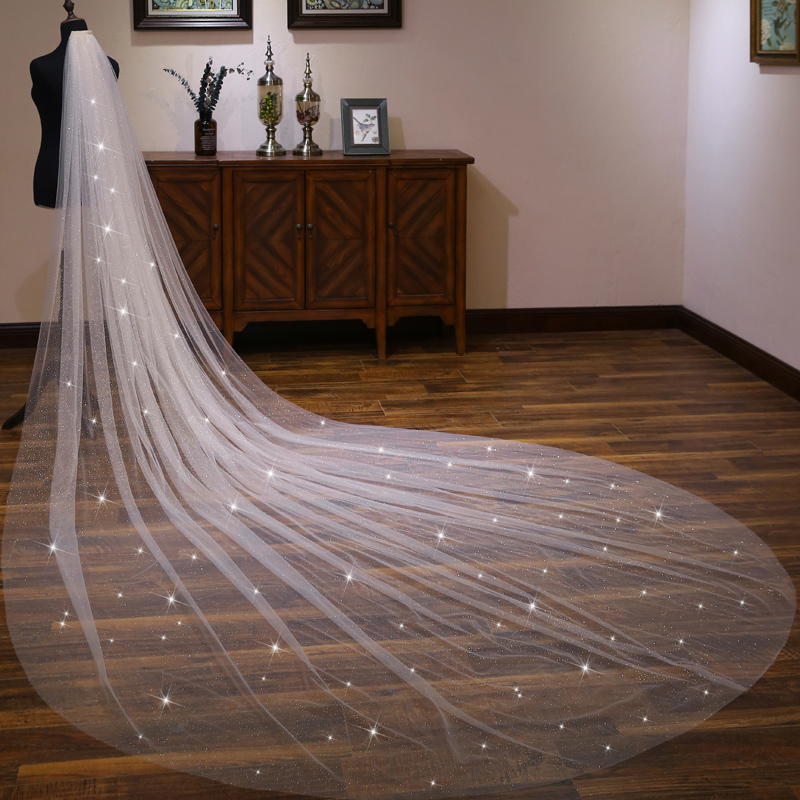 Champagne star veil female bride long tail wedding dress wedding veil headdress long version super fairy forest white