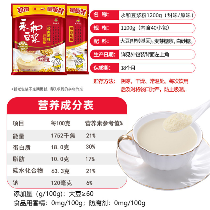 Classic Original 1200g (40 sachets in total) Classic Sweet 1200g (40 sachets in total) (45 sachets in total) Not sweet 450gX3 sachets (45 sachets in total) Original 450gX3 sachets (45 sachets in total) 450g 1 sachet each (original + sweet + not sweet) Raw ground red date flavored soy milk 1.02kg (34 sachets in total)