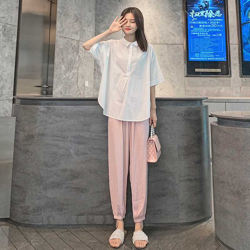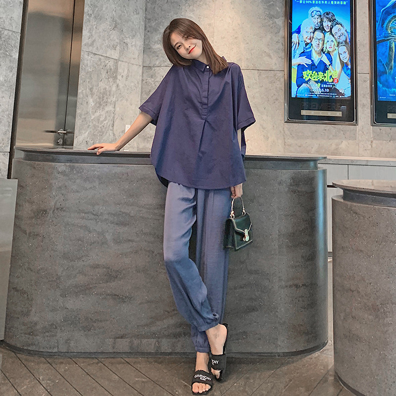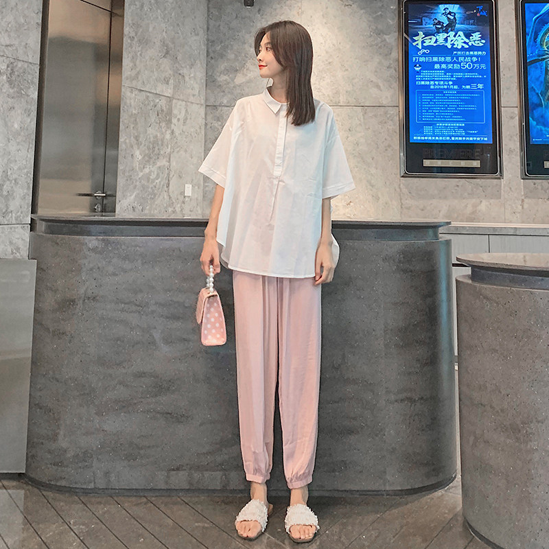 Pregnant women fashion suit summer loose Korean version of large size cotton shirt Lantern wide leg pants out two sets tide mom