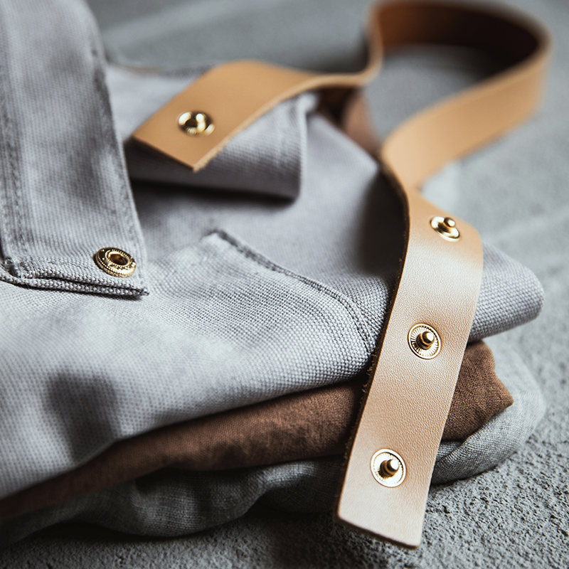 Gray cowhide shoulder strap apron and blue cowhide shoulder strap apron
