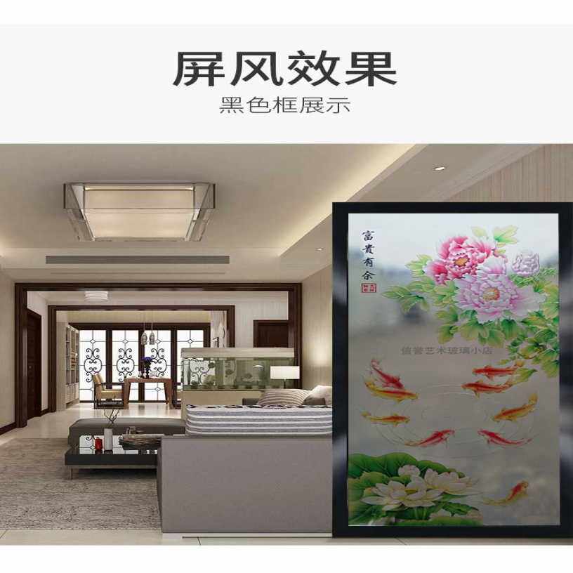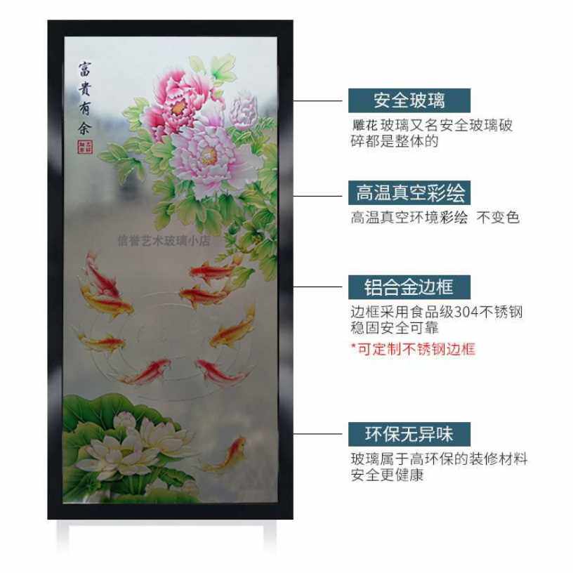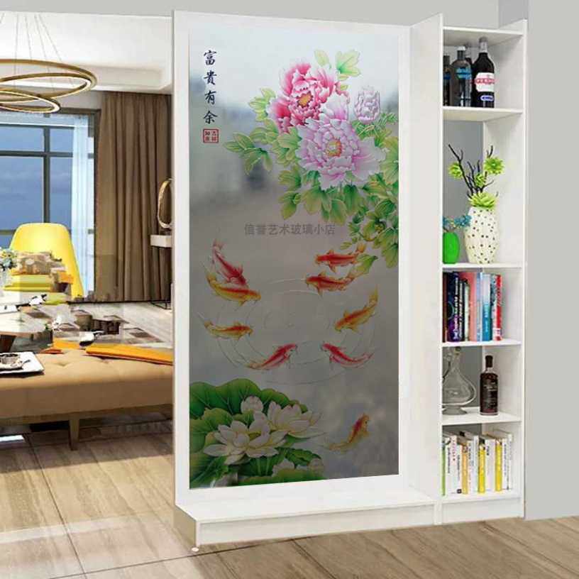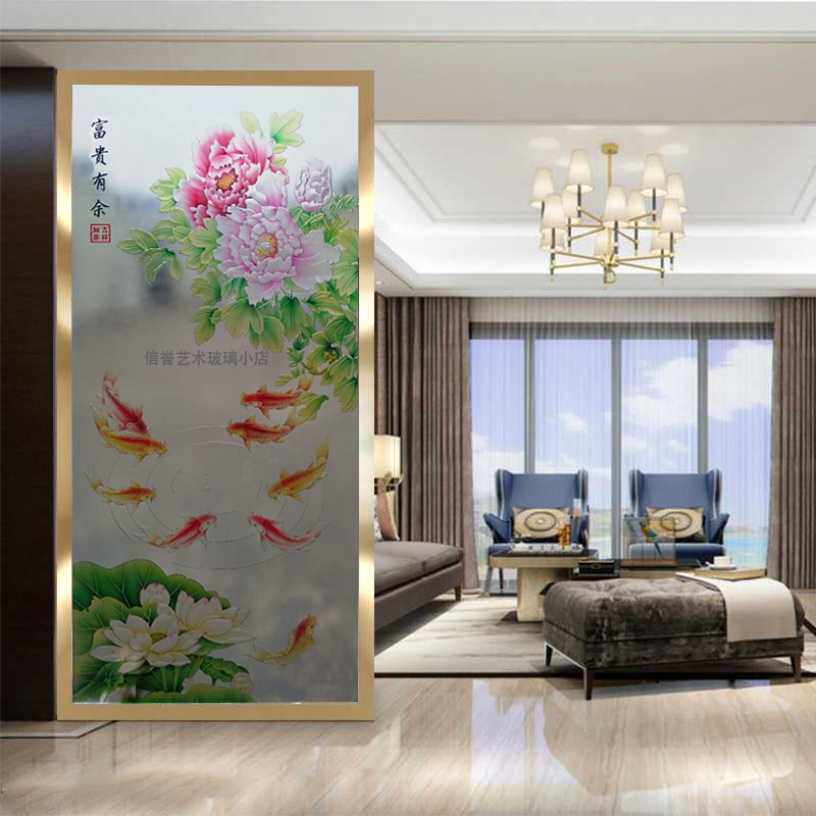 Customized craft carving art glass porch partition screen aisle background wall frosted tempered porch peony fish