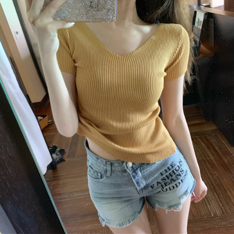 Korean version of matcha green short sleeve slim smart top T-shirt sexy V-neck avocado green ice silk sweater women's thin