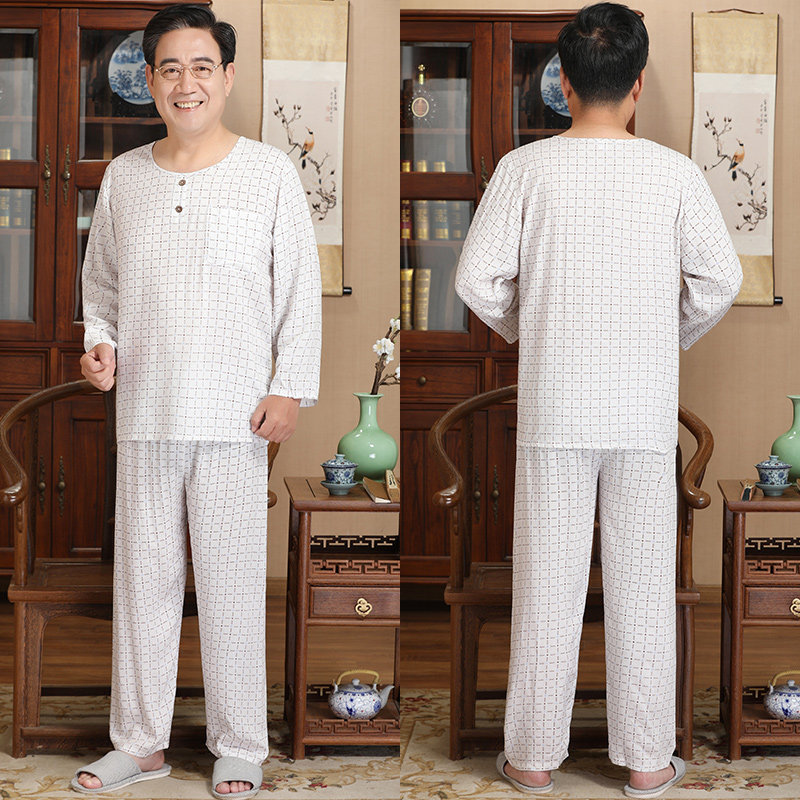 Summer middle-aged and elderly family clothes men's cotton silk pajama pants set father middle-aged artificial cotton old man long sleeve trousers