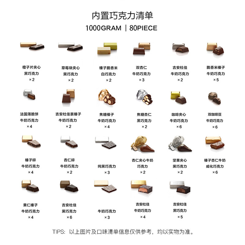 Cocoa butter white sugar whole milk cocoa block skimmed milk Caramel Hazelnut hazelnut crushed almond hazelnut coffee bean coffee crepe, etc. (see the commodity ingredients list for details