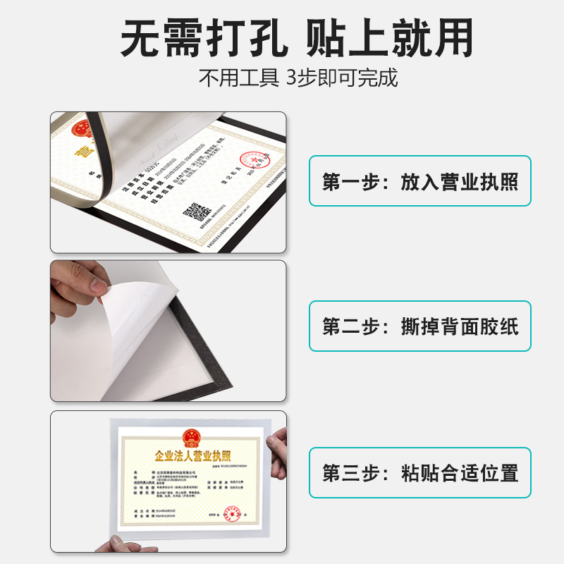 Listing information Magnetic wall stickers Wall stickers Industrial and commercial business license protective cover Horizontal and vertical version of A3 positive copy of three-in-one instant stickers A4 transparent document cover Certificate display stickers Magnetic advertising photo frame