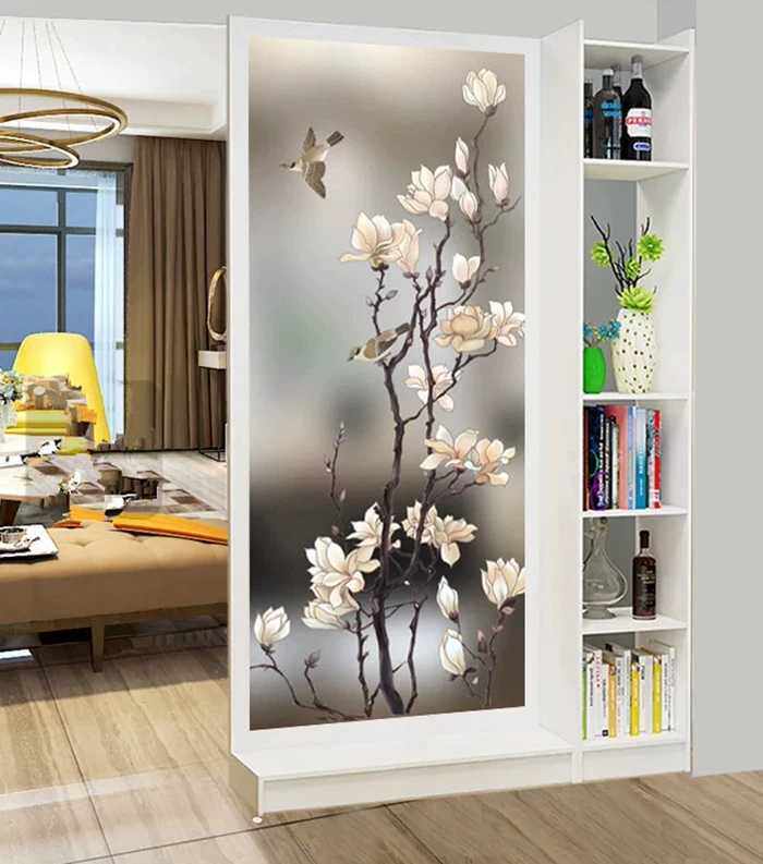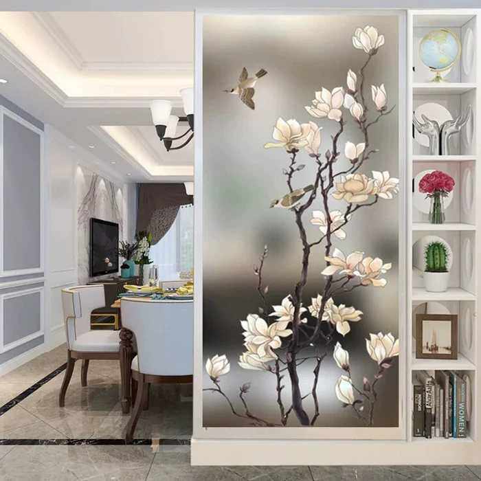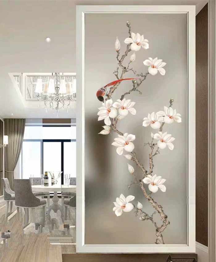 Custom art glass porch partition screen background wall modern style frosted flower painting craft White Magnolia