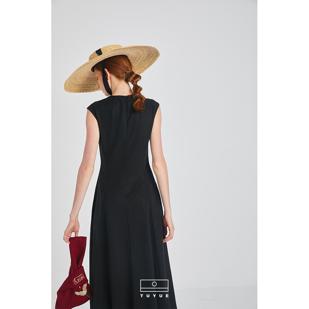 Coated Moon Independent Designer Black Qipao Improved Version Ocean Dress Long Version Summer Brief Round Collar Collection Waist Retro Long Dress