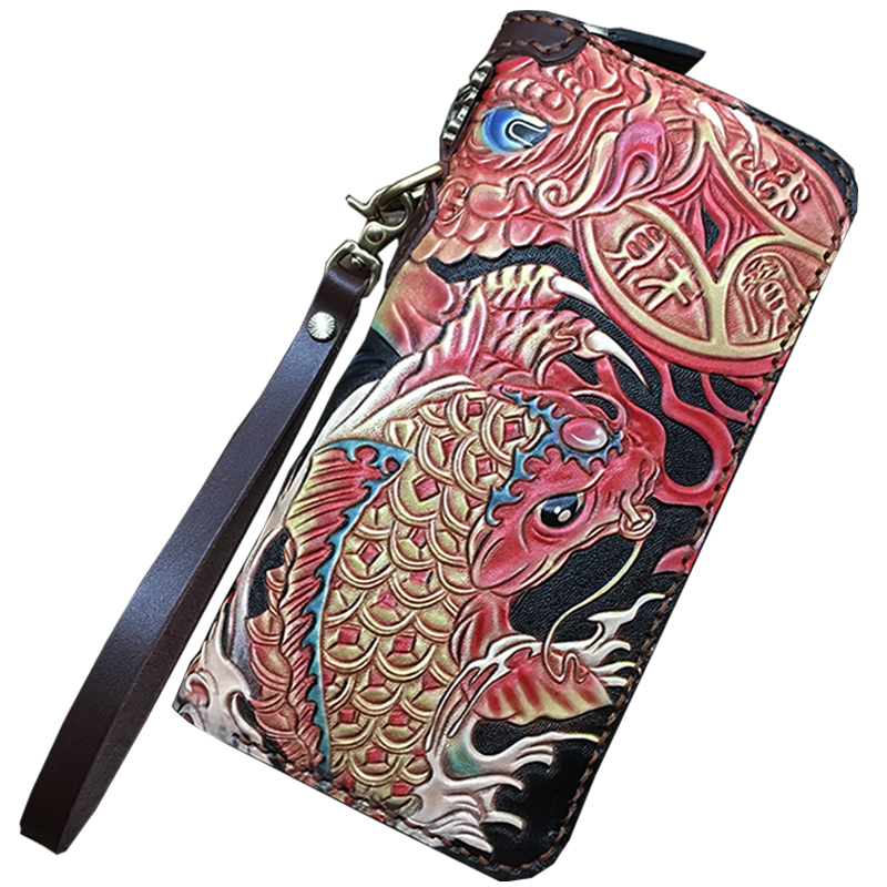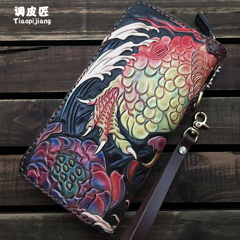 Wallet men's long zipper tide youth wallet men's leather personalized clutch bag women's large capacity handmade leather carving bag