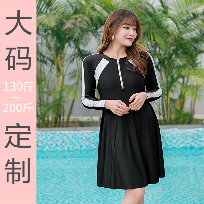 The new long sleeve large size swimsuit woman is conservatively fat mm200 catty and super long skirt type sunscreen swimsuit