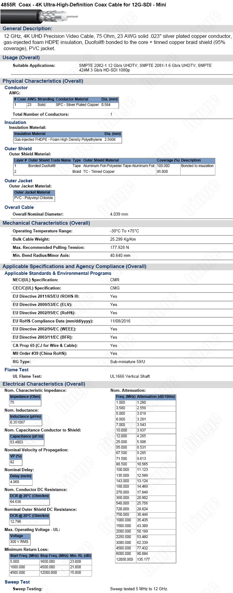 BELden 4855R 12G 4K high definition micro coaxial cable 45 m single link silver plated conductor USA