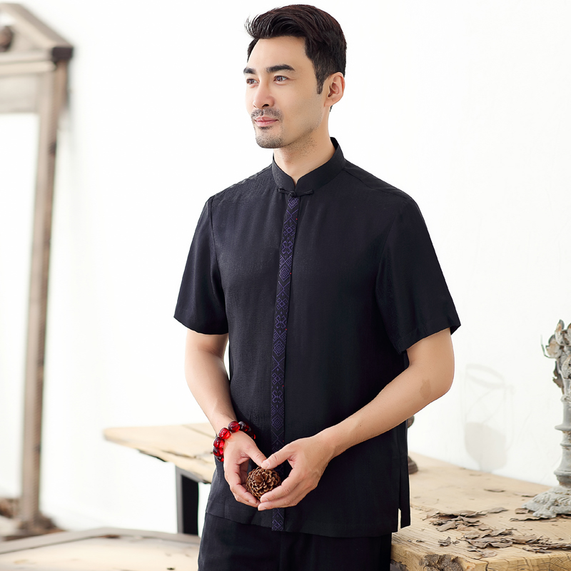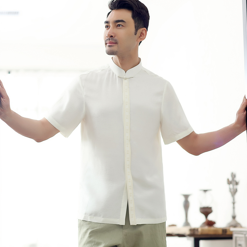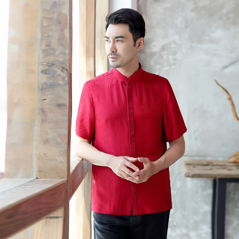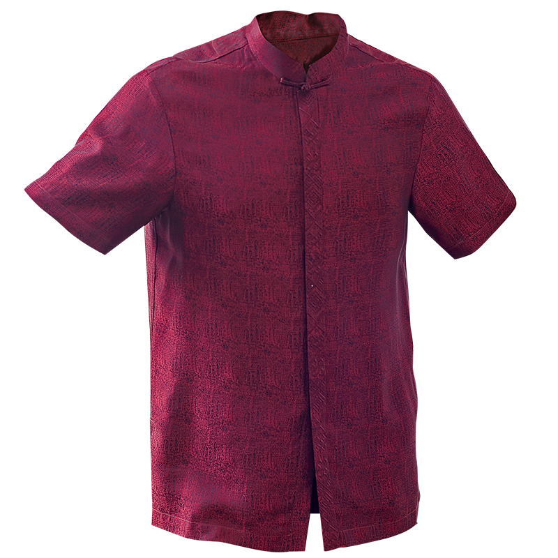 Tang assault-Chinese Chinatown Chinese elderly Summer short sleeve real silk shirt upright collar disc buckle casual Zhongshan clothing